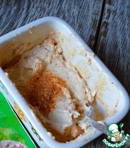 Смешать творожный сыр, майонез и специи.