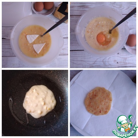 Пока горячая каша, вмешиваем в неё сыр. Даём немного остыть и разбиваем туда яйца. Тщательно перемешиваем. Кладём кукурузный крахмал по ложке. Всё тщательно перемешиваем и пробуем на соль, досаливаем по вкусу. По желанию можете поперчить. Тесто готово. Греем сковороду с маслом и начинаем выпекать блинчики. Один блинчик - половина поварёшки. D блинчиков ~8-10 см. Жарим блинчики до красивого золотистого цвета с обеих сторон. Снимаем на бумажное полотенце, чтобы ушло лишнее масло.