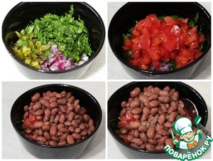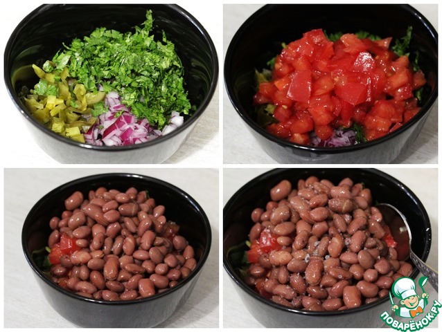Сложить всё в глубокую миску, туда же добавить фасоль.