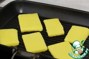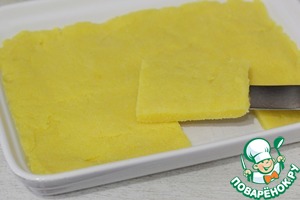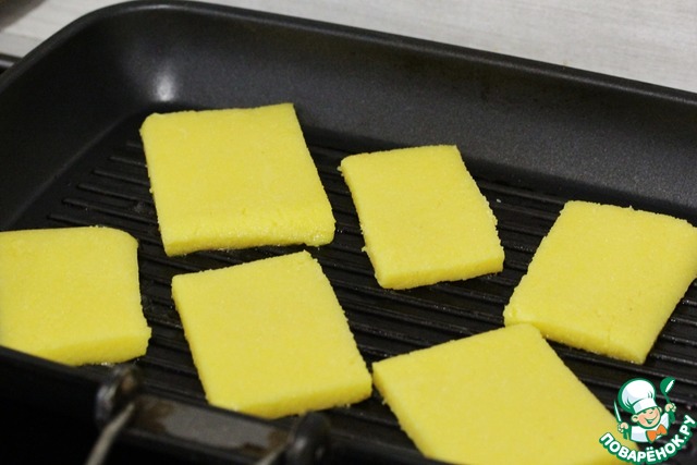 Остывшую нарезать поленту на квадратные или прямоугольные кусочки.