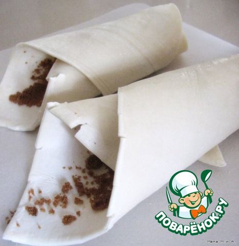 Кладем банан на треугольник теста и посыпаем 1 ст.л. коричневого сахара. Сахар даст цвет и аромат, в отличие от белого.