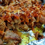 Выкладываем мясо на противень, сверху чеснок и овощную смесь. Запекаем в духовке 40 минут при температуре 180 градусов. Когда мясо уже готово (проверяем вилкой - при прокалывании должен выделяться прозрачный сок), посыпаем его натертым сыром и опять в духовку на 5 минут.