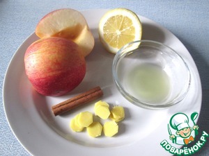 Из половинки лимона выжать сок. У яблока удалить сердцевину и нарезать на дольки. Имбирь нарезать на пластинки.