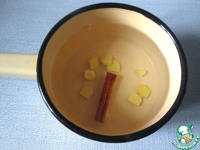 В удобную посуду налить воду, довести до кипения, затем добавить палочку корицы, имбирь и лимонный сок.