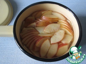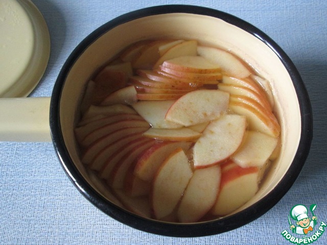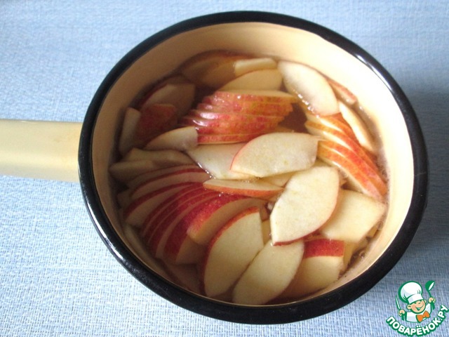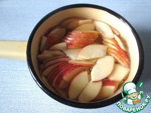Яблоко нарезать на дольки, добавить в сотейник и накрыть крышкой.
