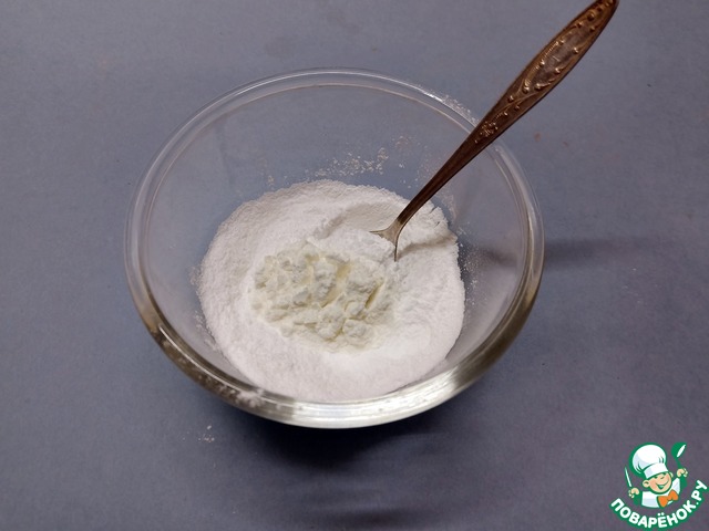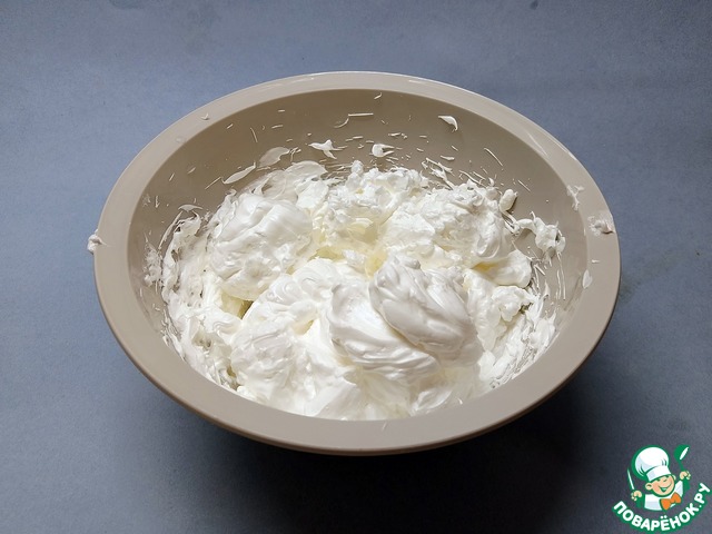 Взбить белки в пышную массу, частями добавляя сахарную пудру с крахмалом.