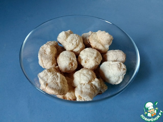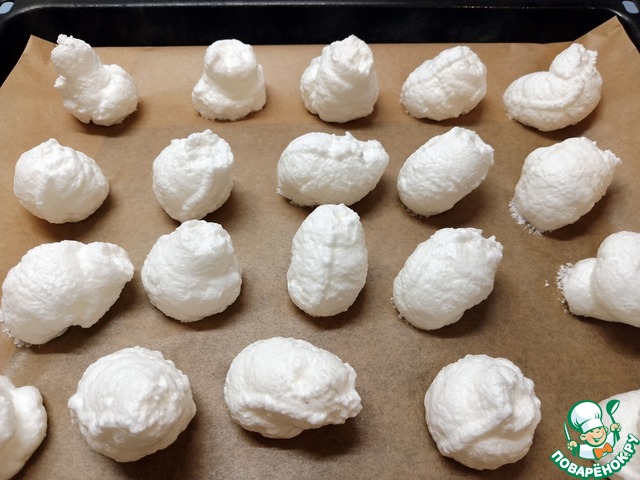 Отсадить взбитые белки на противень с бумагой для выпечки. Можно отсадить через кондитерский мешок или чайной ложкой. Форма может быть различная, она не повлияет на внешний вид конфет.