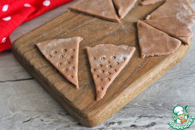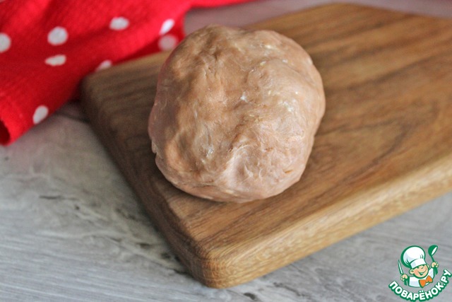 Замесить тесто. Для этого в чашку просеять необходимое количество муки, добавить сахарную пудру, соль, разрыхлитель, какао – порошок, перемешать. В чашку с мучной смесью добавить холодное сливочное масло, нарезанное небольшими кусочками, перетереть руками в «мокрую» крошку. Затем добавить желток и сметану, замесить мягкое, не липкое тесто. Тесту придать форму шара, завернуть в пищевую пленку и охладить в холодильнике в течение 30 минут.