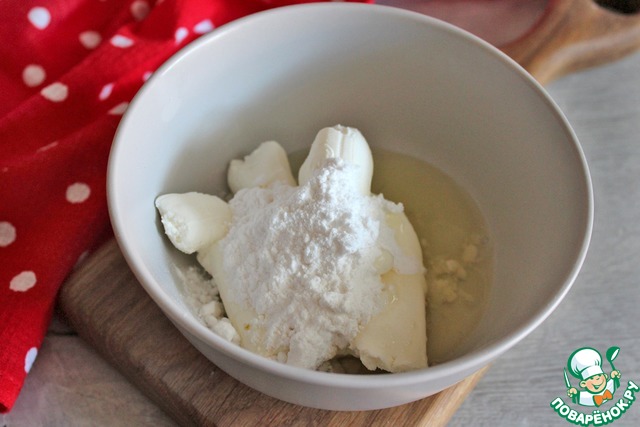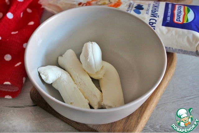 Пока тесто охлаждается, приготовить начинку. Для этого в чашку выдавить творожный сыр ТМ Hochland.