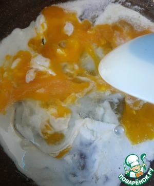 Начинаем тут же, на медленном огне, помешивать яичную смесь. Не должно появиться "прихватившихся" частей яичницы.
