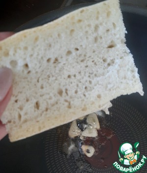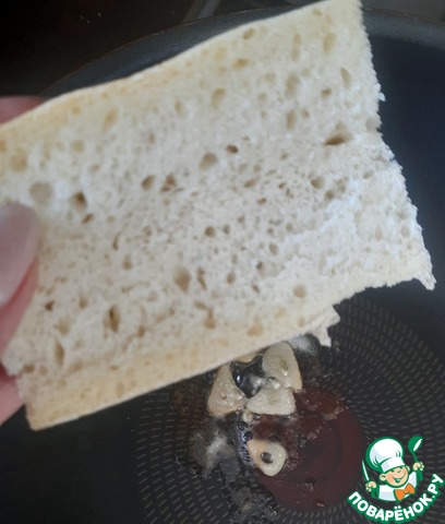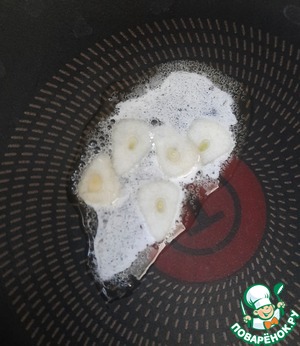 На оставшемся сливочном масле поджариваем чеснок. Он должен отдать свой аромат и на этом его миссия заканчивается- мы убираем его из сковороды (по секрету - я обожаю жаренный чеснок, поэтому у меня безотходное производство)