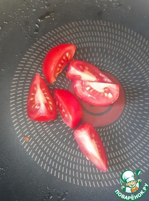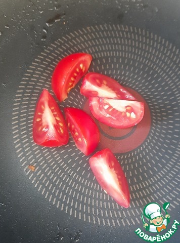 Вынимаем багет и пока выкладываем на него наш сливочный скрэмбл, припускаем около минуты нарезанные помидорки (они не должны стать сильно мягкие, они должны стать более ароматные и приятно теплые).