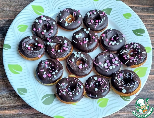 Обмакнуть пончики в шоколадную глазурь и посыпать кондитерской посыпкой.