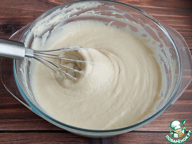 Тесто должно быть однородным, не очень жидкое, но и не густое. Консистенция как у густой сметаны, на венчике задерживается, медленно стекая.