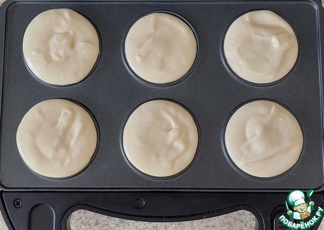 В мультипекарь установить панели для пончиков. Включить и подождать пока загорится зелёный индикатор. Наливать в ячейки по 1 ч. л. с горкой теста. Бережно закрыть и защёлкнуть крышку.