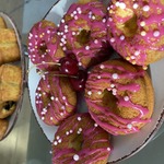 Обмакнуть в белую глазурь и посыпать кондитерской посыпкой. Когда у меня оставалась половина белой глазури, я добавила розовый краситель в неё, и дальше обмакивала уже в розовую глазурь.