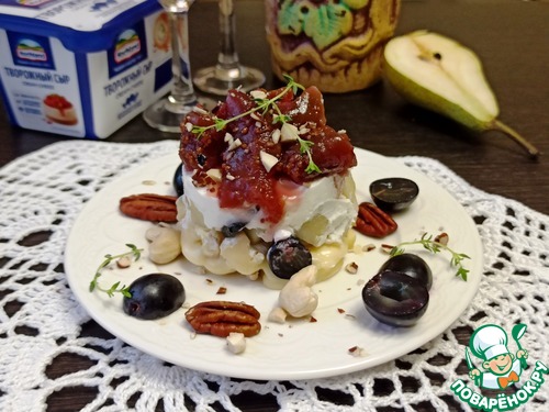 Перед подачей на сырную пирамидку положить ложку несладкого ягодного варенья, можно пятиминутку или просто измельченные ягоды с небольшим количеством пудры. И посыпать ореховой крошкой.