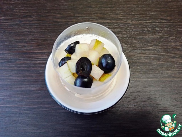 Второй слой - кубики нарезанной груши и виноград без косточек.