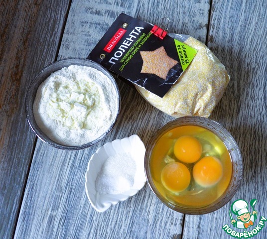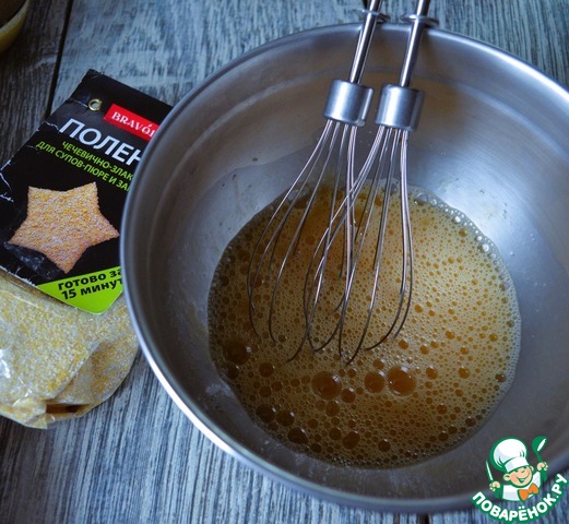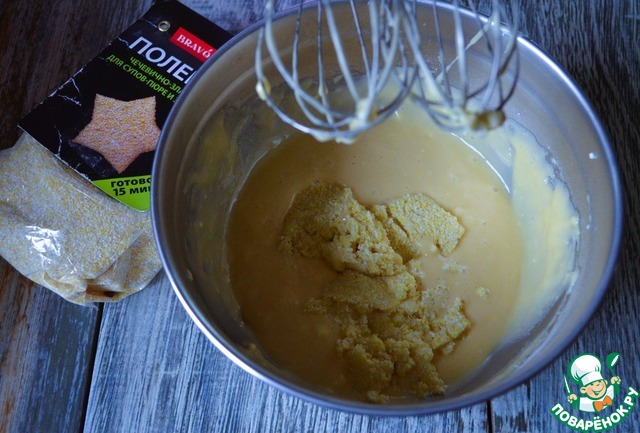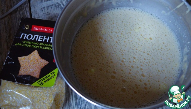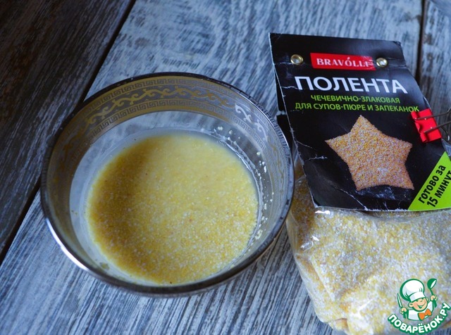 Поленту залить горячей водой ( 50-70 мл., из общего количества).