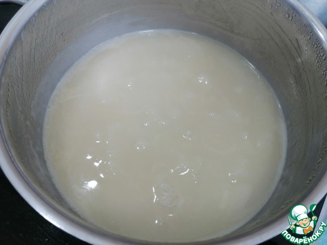 Как только мука с бульоном достигнет консистенции сметаны, включить плиту, постепенно доливая остатки бульона.