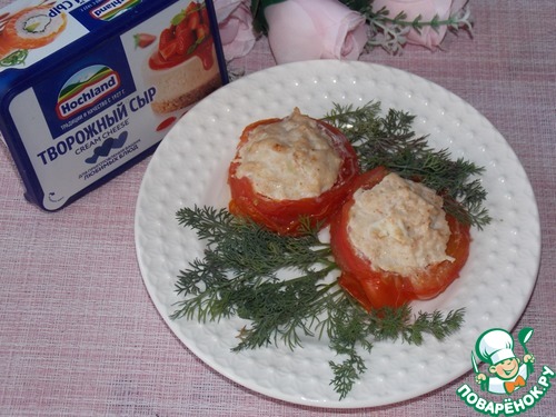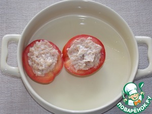 Разложить подготовленную начинку в помидоры. Выложить их в форму для запекания, смазанную растительным маслом. Запекать при 180С, примерно 25 минут.