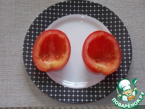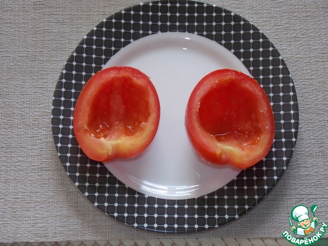 Крупный помидор разрезать пополам. Аккуратно убрать середину с семенами.