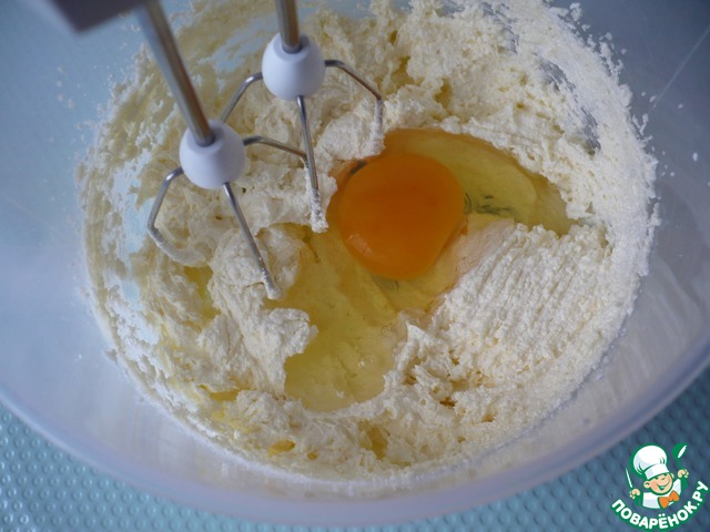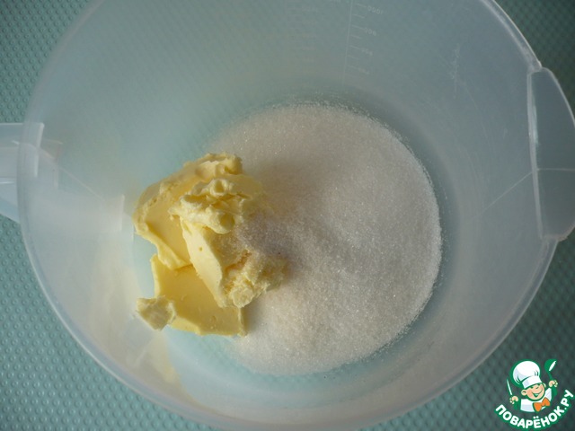 В миске взбейте сливочное масло комнатной температуры с сахаром и ванильным сахаром до кремообразного состояния.