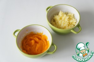 Отварной картофель натрите на мелкой тёрке. Тыкву сварите до мягкости и пюрируйте блендером.