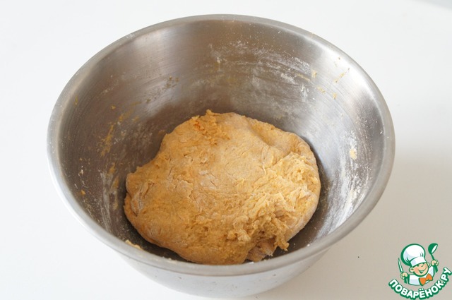 Смешайте овощное пюре, томат-пасту, соль, мускатный орех и муку. Замесите тесто, уберите на полчаса в холодильник. Тесто получается вязкое, липнет к рукам.