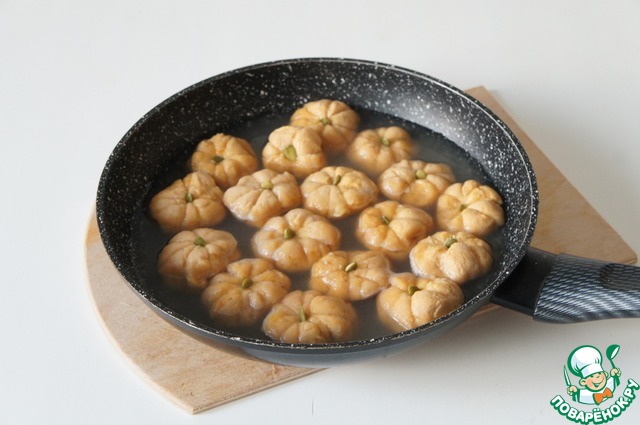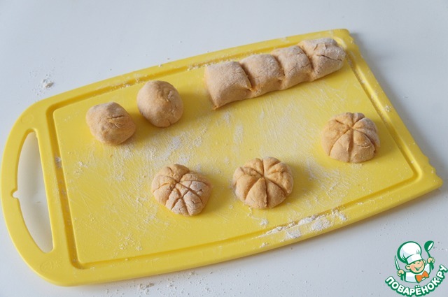 На подпыленном мукой столе скатайте колбаску из теста, нарежьте на кусочки. Скатайте каждый кусочек в шарик, ниткой сделайте бороздки, как у тыквы. В серединку каждой "тыковки" воткните семечко.