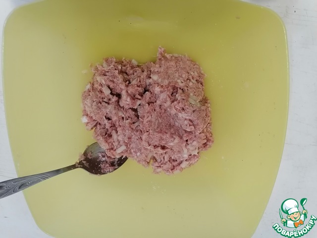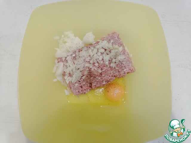 В большой миске смешать фарш, 1 яйцо, мелко нарезанный лук