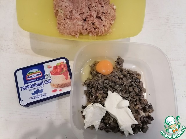 Для начинки смешать нарезанные кубиками и обжаренные шампиньоны, яйцо и творожный сыр
