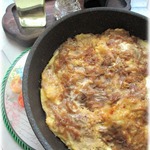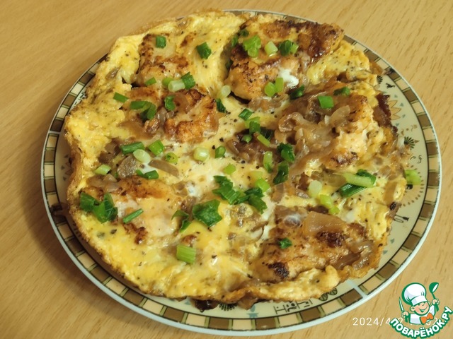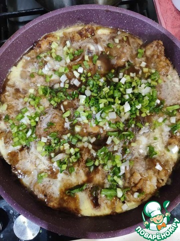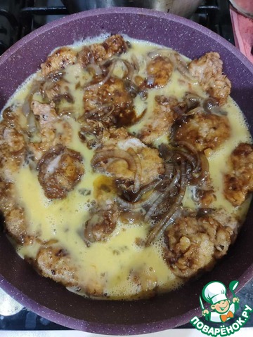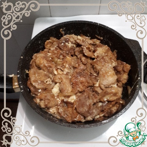 Пока обжаривается мясо, порезать полукольцами лук и обжарить до мягкости, залить лук соевым соусом, пару минут потушить и выложить в соус с луком обжаренное мясо и аккуратно перемешать. Залить остатками яйца и накрыть крышкой