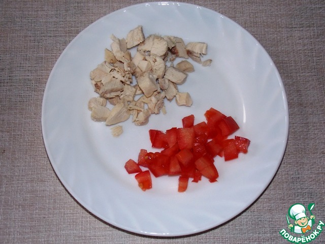 Отварную куриную грудку и помидор нарезать небольшими кубиками.