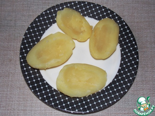 Отварной картофель разрезать пополам, аккуратно при помощи чайной ложки убрать серединку.
