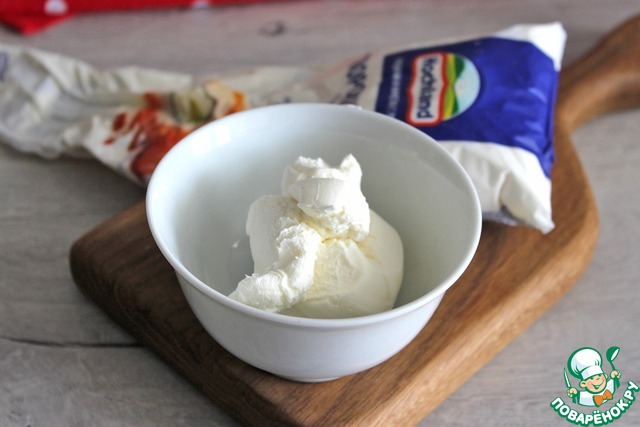 Приготовить сырные шарики. Для этого творожный сыр ТМ Hochland выложить в чашку.