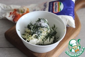 Добавить мелко порезанную зелень укропа, мелко натертый чеснок, посолить и вымешать до однородности.