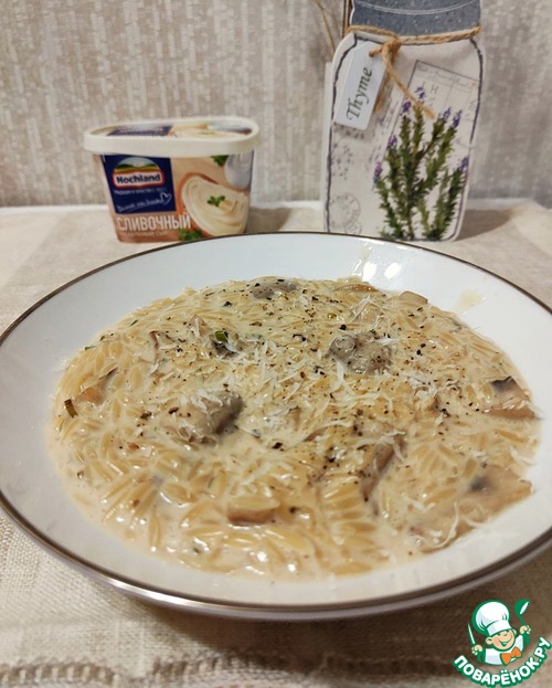 Есть такая паста в виде рисинок. Называется risoni. Ее обычно готовят сразу с соусом. А можно приготовить по методу приготовления ризотто. Это немного проще, чем из риса, но тоже очень вкусно. Мой вариант приготовлен из пасты risoni с шампиньонами и сливочным сыром ТМ Hochland. Этот достаточно простой рецепт поможет разнообразить ежедневное меню, особенно для деток.
