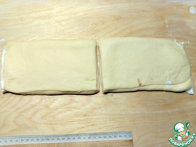 Сложить тесто в 3 слоя. Прокатать скалкой.