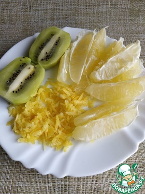 Подготовить лимон и киви. С лимона снять цедру, очистить белый слой (здесь он был довольно толстый), разделить на дольки и потом нарезать на кусочки. Пленку с долек можно не удалять. Киви очистить и нарезать на кусочки.
