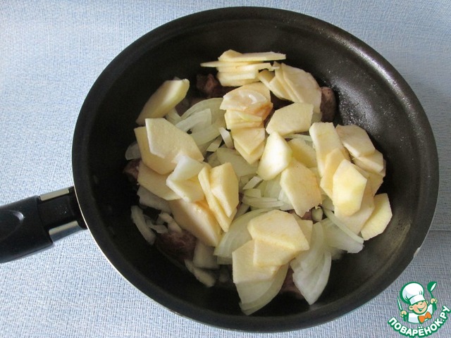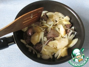 Выложить лук и яблоко к печени. Посолить и поперчить по вкусу.