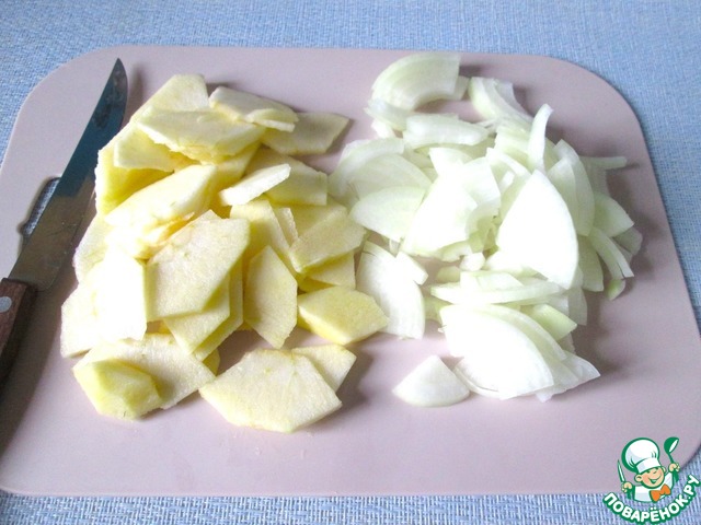 Яблоко вымыть, очистить, удалить сердцевину и нарезать пластинами. Лук очистить и нарезать полукольцами или четвертинками.