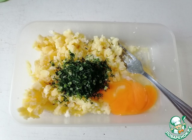 Отварной картофель размять вилкой, добавить 2 яйца, укроп, соль