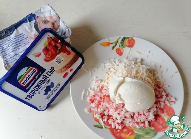 Для начинки смешать натертое на мелкое терке вареное яйцо, мелко нарезанные крабовые палочки и творожный сыр