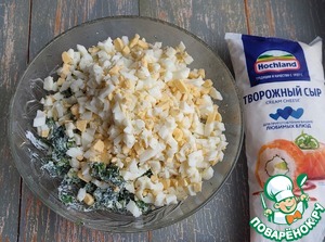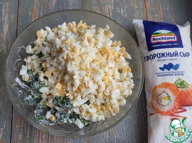Предварительно отваренные яйца очистить, мелко нарезать кубиками.