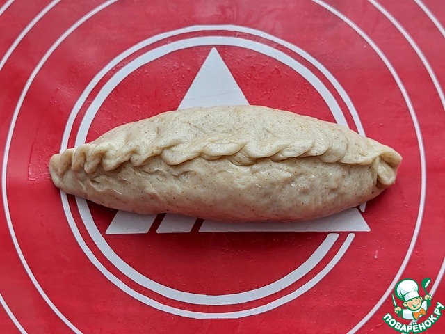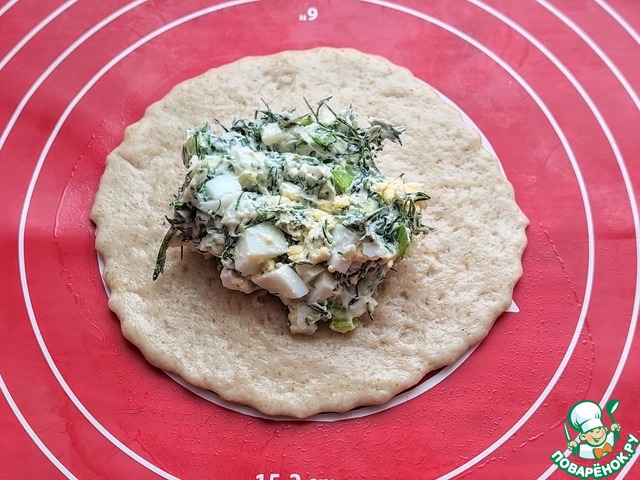 Разделить тесто на 20 кусочков. Каждый кусочек раскатать в круг. В центр положить 1 ст. л. начинки.