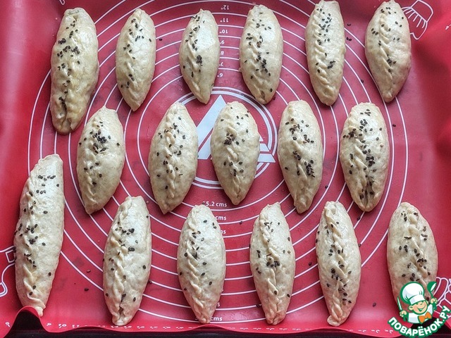 Переложить пирожки на противень застеленный силиконовым ковриком. Смазать желтком (желток можно разбавить 1 ч. л. молока), посыпать кунжутом. Готовить в духовке, заранее разогретой до 180 гр., 20 мин.