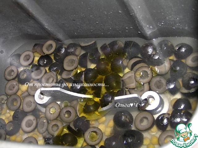 В контейнер хлебопечки налейте воду, добавьте соль, оливковое масло, каперсы и нарезанные кружочками маслины.