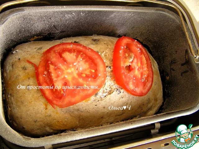 Включите хлебопечку, выберите программу "Хлеб из цельной муки", вес 1500 г и светлый цвет корочки. Нажмите кнопку "Старт". За 30-40 минут до окончания приготовления хлеба, смажьте поверхность оливковым маслом, выложите ломтики помидора и посыпьте солью.