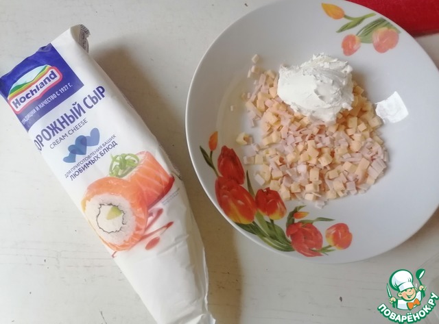 Мелко нарезать ветчину и сыр, добавить творожный сыр